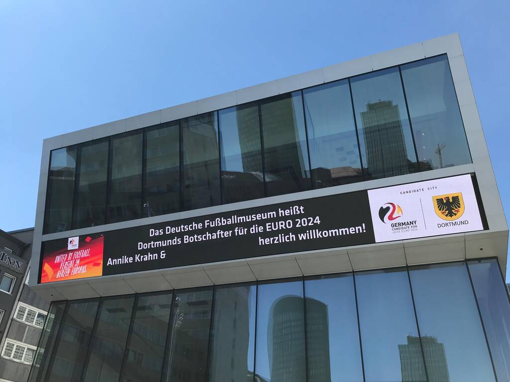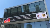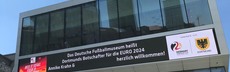 In einer vierten Vitrine der EM-Inszenierung schlägt ein klassischer weißer Briefumschlag die Brücke in die Zukunft. Als UEFA-Präsident Aleksander Čeferin ihn im September 2018 öffnete, stand fest: Deutschland richtet die EM 2024 aus. Seither läuft die Arbeit des Organisationskomitees auf Hochtouren. Auf Touchscreens lassen sich Filme abrufen, die wichtige Stationen des Bewerbungs- und Vorbereitungsprozesses zeigen. Darüber sind auf einer überdimensionalen Deutschlandkarte die zehn Spielorte der EM 2024 abgebildet OK-Chef Philipp Lahm verspricht mit seinem Zitat, das als Leitgedanke über diesen Ausstellungbereich steht: „Wir wollen gemeinsam ein riesengroßes Fest mit ganz Europa feiern."